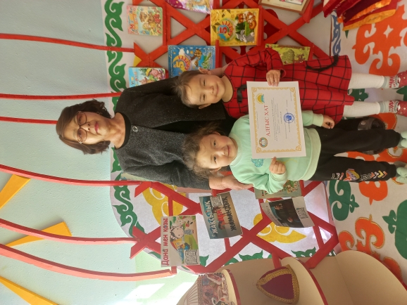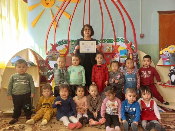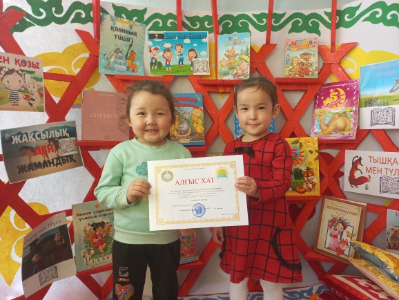 Кітап бұрышын ұйымдастыру бойынша "БАЛАЛАРҒА БАЗАРЛЫҚ" облыстық байқауының аудандық кезеңіне белсенділікпен қатысқаны үшін "Балапан" кіші тобының тәрбиеленушілері, жетекшісі Саламатова Күлайым АЛҒЫС ХАТпен марапатталады!