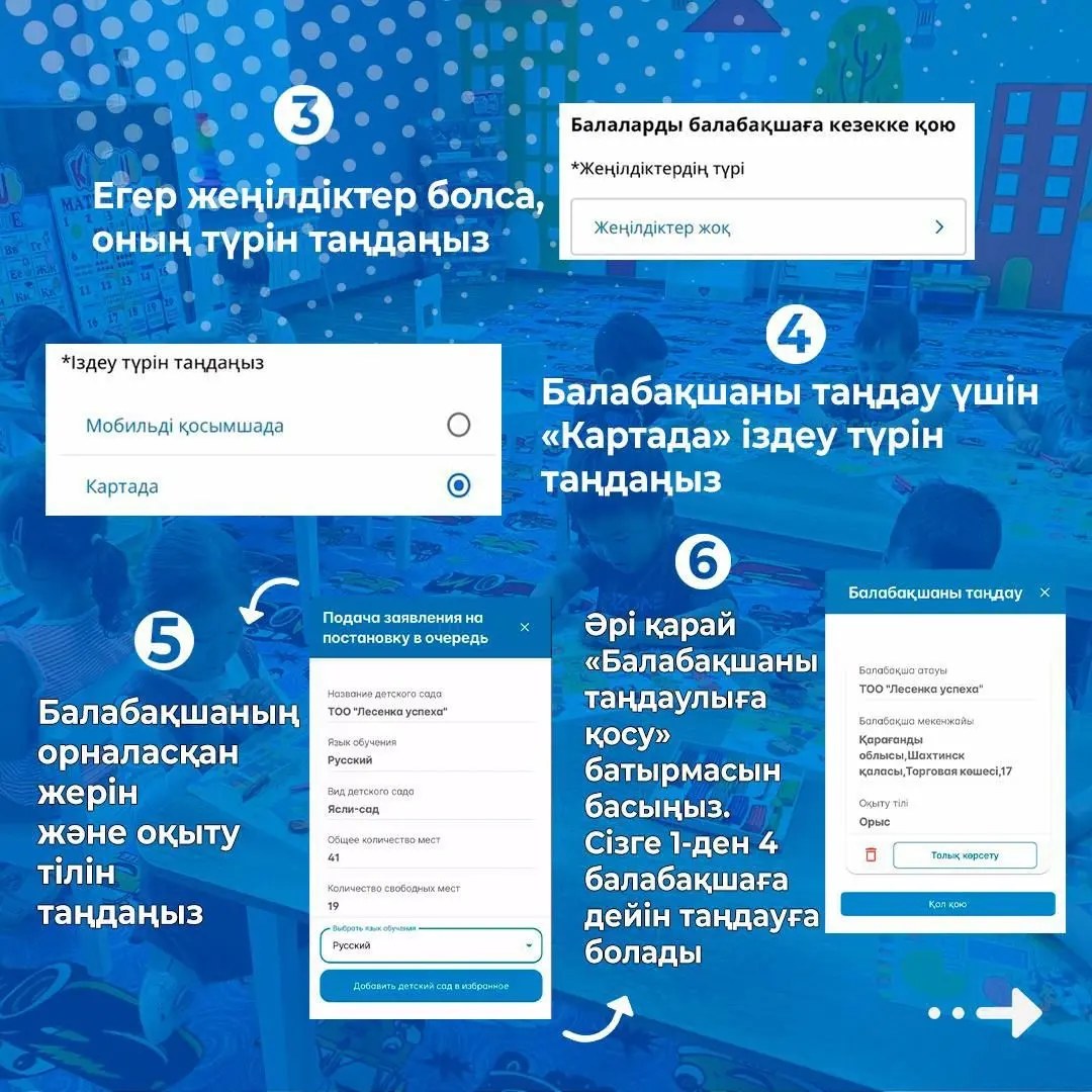 Жаңа модель отбасылық сұраныстарға негізделген төрт балабақшаны таңдауға мүмкіндік береді. Төмендегі бейнедегі нұсқаулық сәйкес ата-аналар балаларын кезектілікке қоя алады.