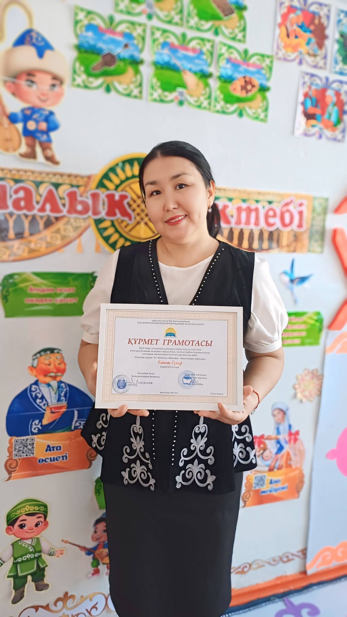 Білім беру саласының дамуына қосқан елеулі үлесі мен еліміздің болашақ иелеріне сапалы білім, өнегелі тәрбие берумен қатар қоғамдық жұмыстарға белсене араласқаны үшін бөбекжай-бақшамыздың тәрбиешісі Көбекова Гүлнұр Болатбекқызы облыстық білім басқармасының