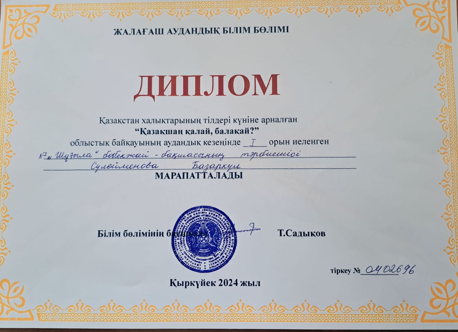 ҚҰТТЫҚТАЙМЫЗ! Қазақстан халықтар тілдері күніне арналған "Қазақшаң қалай, балақай?" облыстық байқауының аудандық кезеңінен әріптесіміз тәрбиеші Сүлейменова Базаркүл жүлделі I-орын иеленді. Әріптесімізге шығармашылық табыс тілейміз!